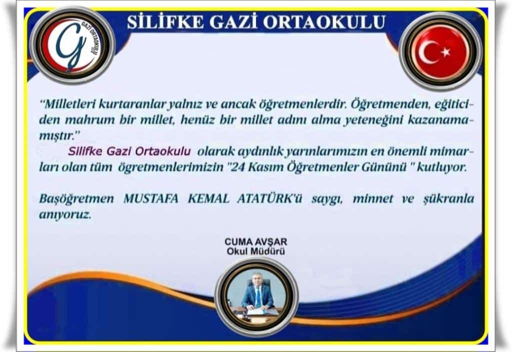 "Milletleri kurtaranlar yalnız ve ancak öğretmenlerdir. Öğretmenden, eğiticilerden mahrum bir millet, henüz bir millet adını alma yeteneğini kazanamamıştır." Silifke Gazi Ortaokulu olarak aydınlık yarınlarımızın en önemli mimarları olan tüm öğretmenlerimizin ''24 Kasım Öğretmenler Gününü" kutluyor. Başöğretmen MUSTAFA KEMAL ATATÜRK'ü saygı, minnet ve şükranla anıyoruz.